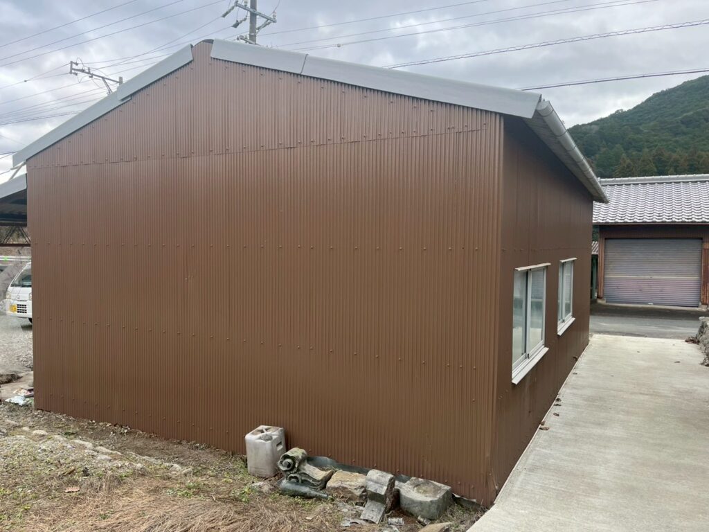 これまでの下地処理・屋根塗装工程に続き、今回は多気町にて倉庫外壁の中塗りとスレート屋根の上塗り作業を行いました。