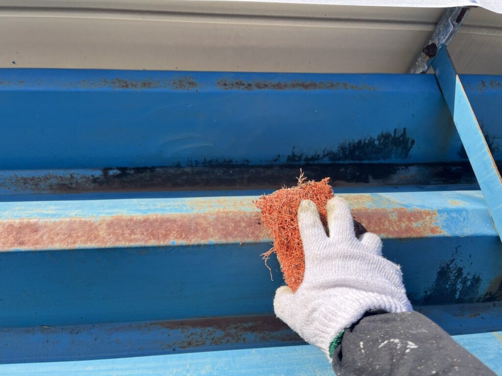 ケレン後は、折板屋根に合わせたサビ止め(下塗り) を施工しました。