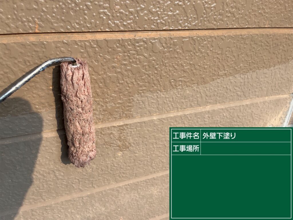 📸 外壁下塗り中:ローラーを使って均一に塗布しています。