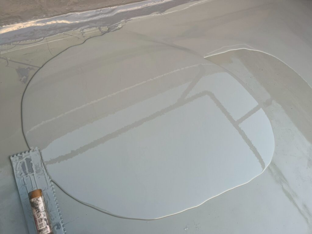 今回は、前回の通気シート貼り・ウレタン1回目塗布に続き、ウレタン防水2回目塗布(上塗り防水層)の作業を行いました。